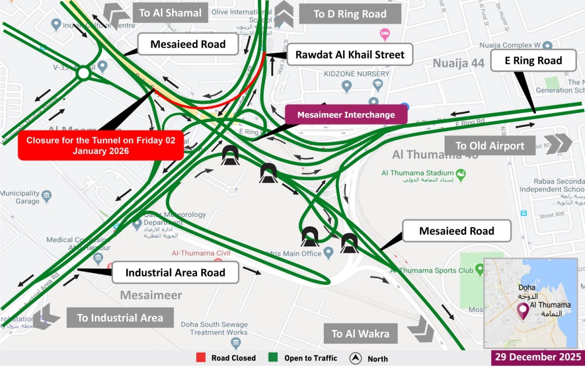 Doha, Qatar – The Public Works Authority (Ashghal) has announced a temporary closure of the Mesaimeer Interchange Tunnel impacting traffic flow between Mesaieed Road and Rawdat Al Khail Street. This Mesaimeer Interchange closure, scheduled for Friday, January 2, 2026, from 2:00 AM to 10:00 AM, is to facilitate crucial maintenance work on the key infrastructure point. Motorists are advised to plan alternative routes during these hours to avoid delays.
