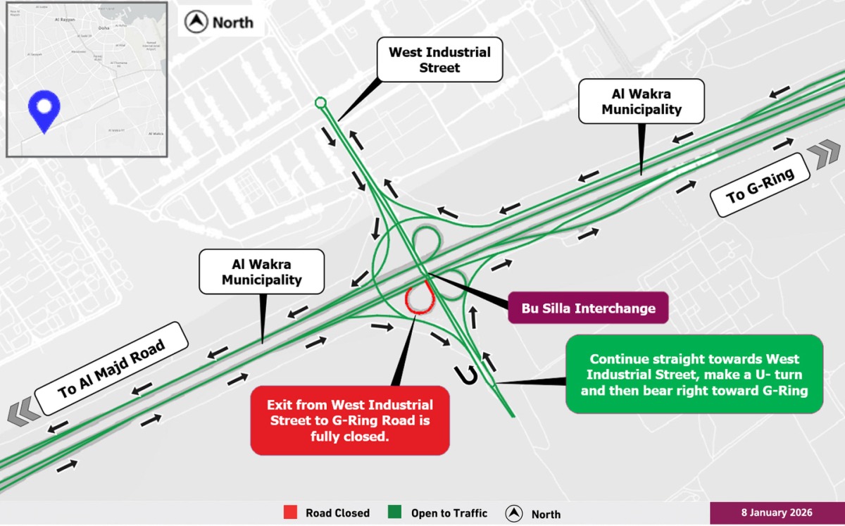 Doha, Qatar – The Public Works Authority (Ashghal) has announced a temporary full closure of the Bu Silla Interchange, impacting access to the G-Ring Road from West Industrial Street. This traffic closure, scheduled to begin at midnight on Sunday, January 11, 2026, and continue until 5:00 AM on Sunday, January 18, 2026, is intended to facilitate essential road maintenance and improvement projects within the burgeoning Doha infrastructure network. Motorists are advised to plan alternative routes during this period.