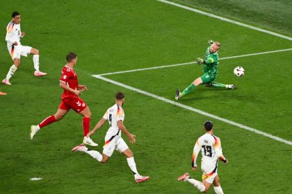 Germany's Jamal Musiala scored his team's second goal past Denmark's goalkeeper Kasper…