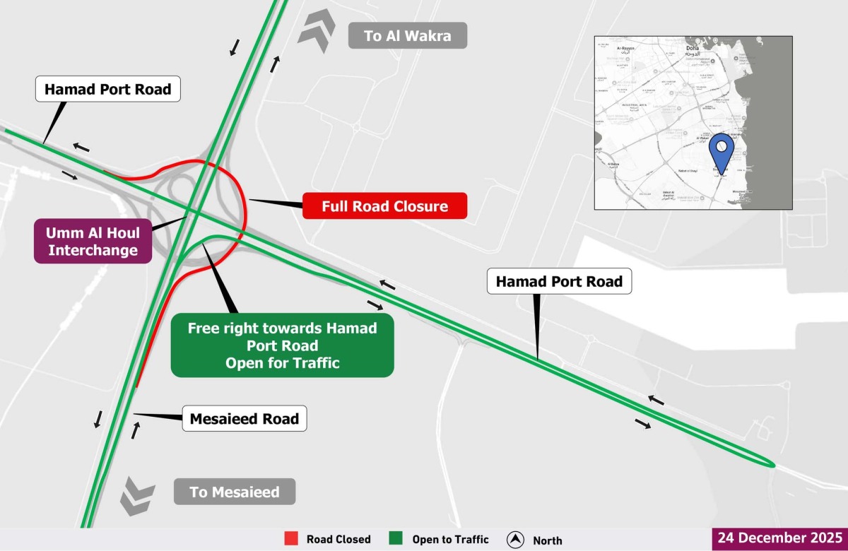 Doha, Qatar – The Public Works Authority (Ashghal) has announced a temporary full closure of the exit from Umm Al Houl Interchange impacting traffic flow to Hamad Port Road. This Umm Al Houl Interchange closure will begin at 2:00 AM on Friday, December 26, 2025, and remain in effect until 10:00 AM on Friday, January 2, 2026. Motorists traveling from Mesaieed Road towards the port are advised to plan alternative routes during this period.